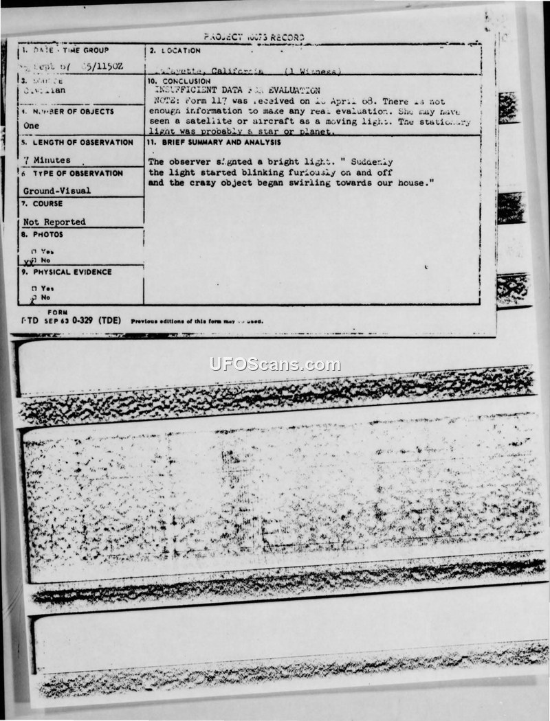 A 17-year-old witness reported a bright, swirling light in Lafayette, California, on September 5, 1967. The Air Force later concluded there was insufficient data to evaluate the sighting.