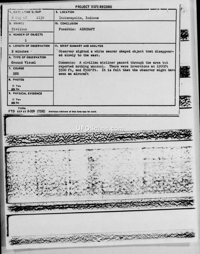 This document details a 1967 UFO sighting in Indianapolis where a witness reported a saucer-shaped object. The Air Force concluded the witness likely observed an aircraft, noting the presence of a civilian airliner in the area at the time.