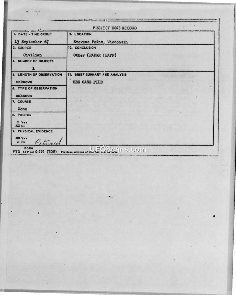 Project 10073 Record — Stevens Point, Wisconsin, 13 September 1967