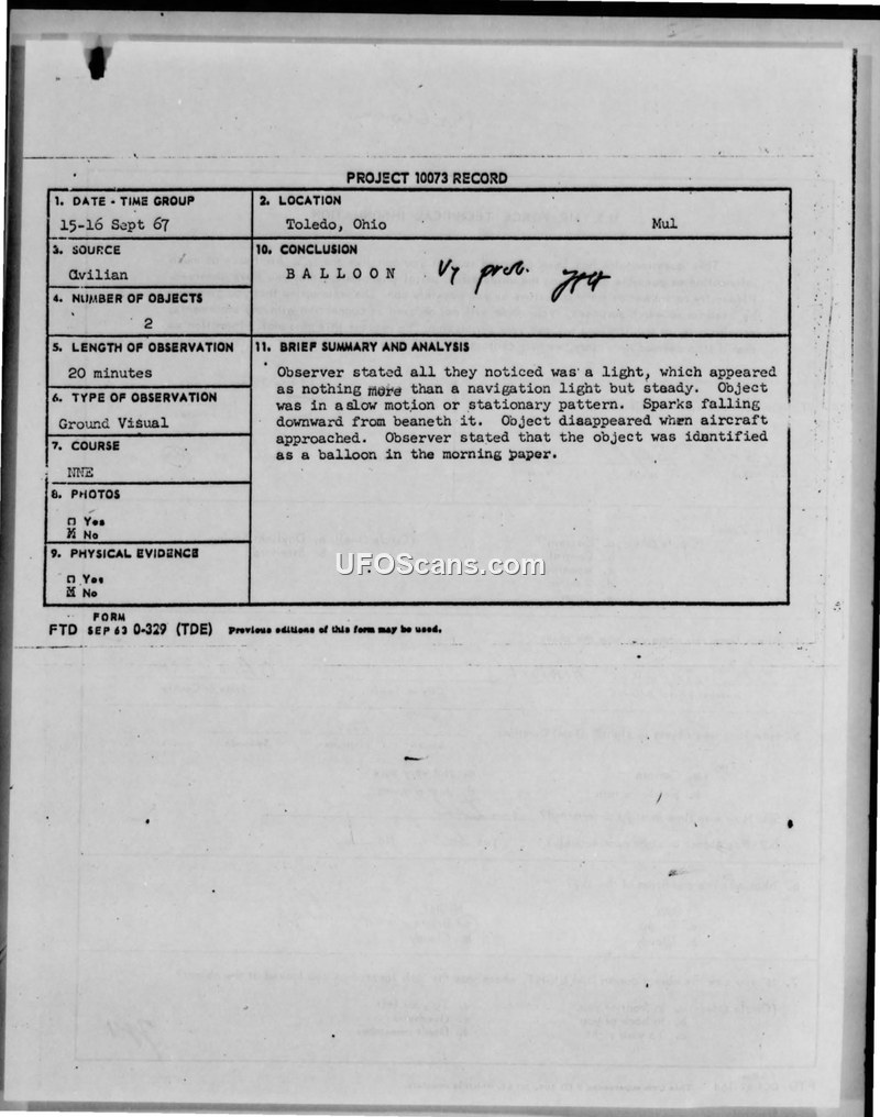 Project 10073 Record — Toledo, Ohio, 15-16 September 1967