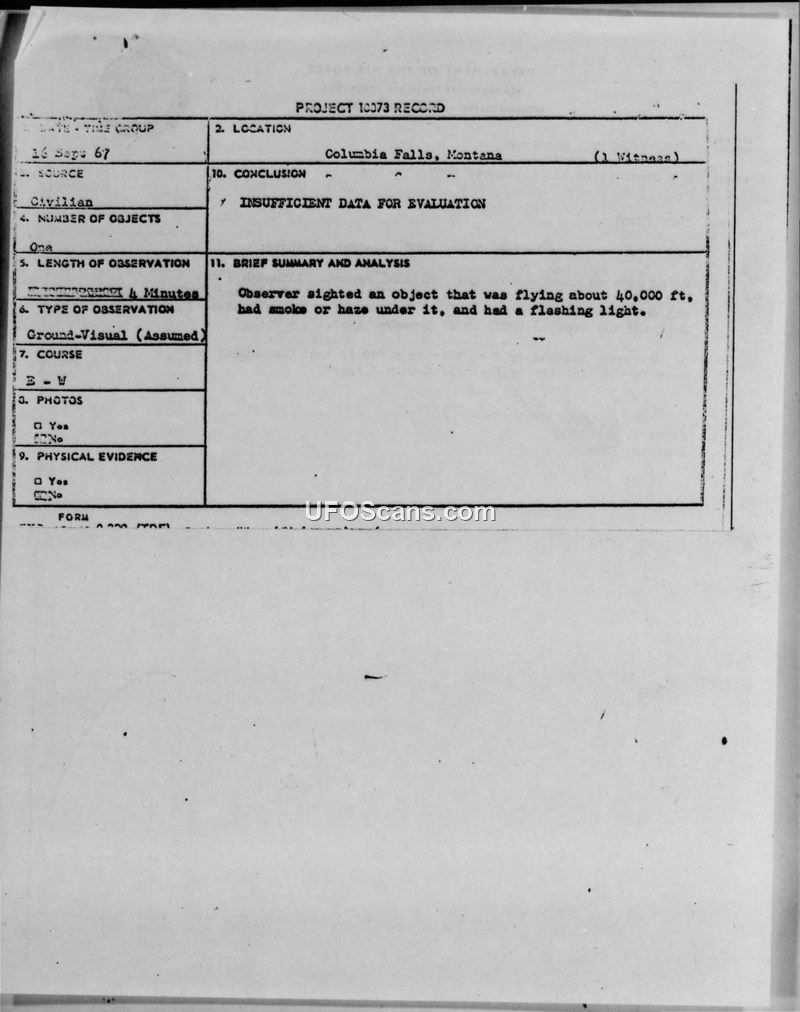 UFO Observation, 16 September 1967 — Columbia Falls, Montana