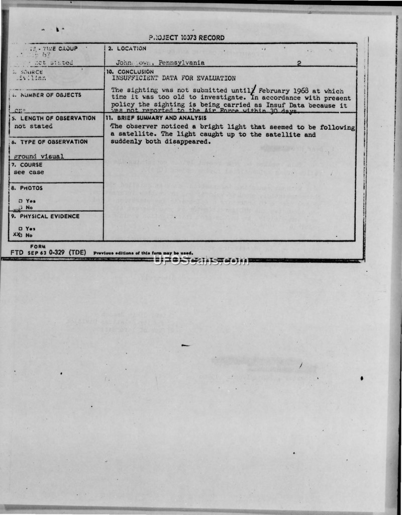 A 1967 UFO sighting report from Johnstown, PA, was filed too late for Air Force investigation. The case was officially closed as 'Insufficient Data'.