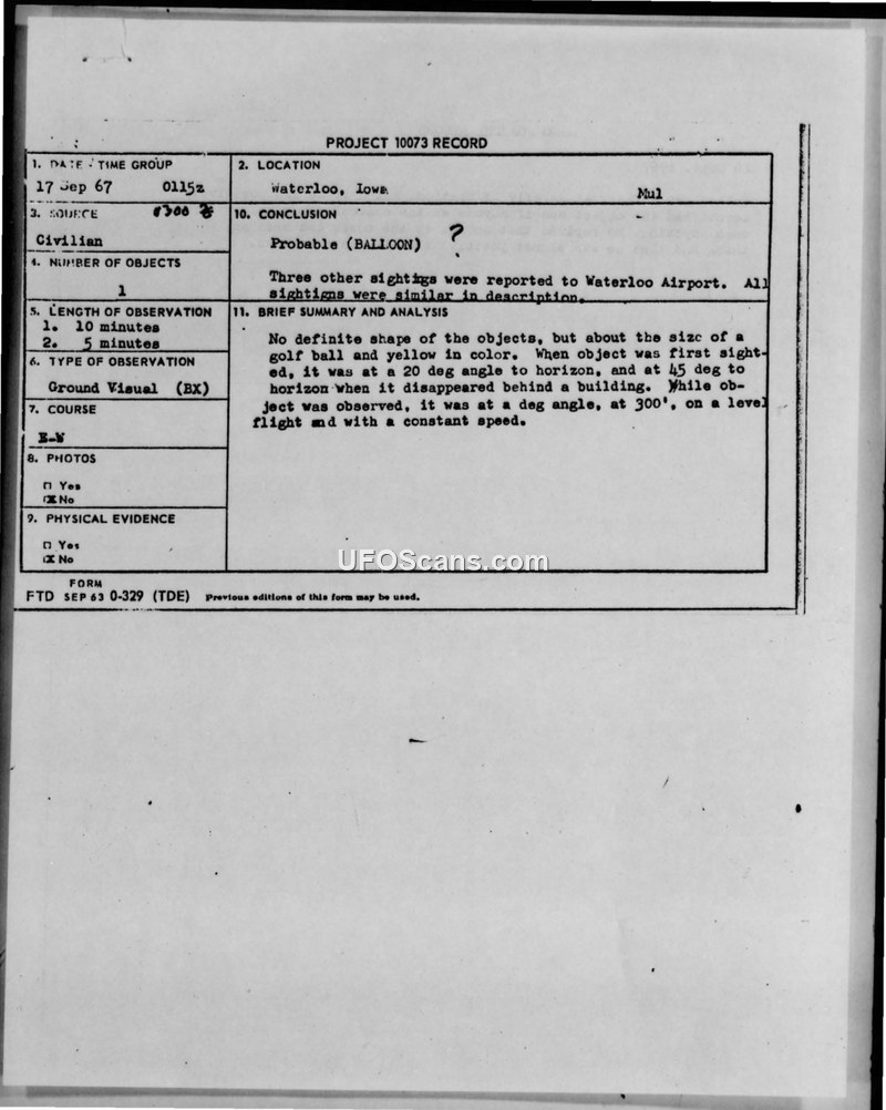 PROJECT 10073 RECORD - Waterloo, Iowa Sighting