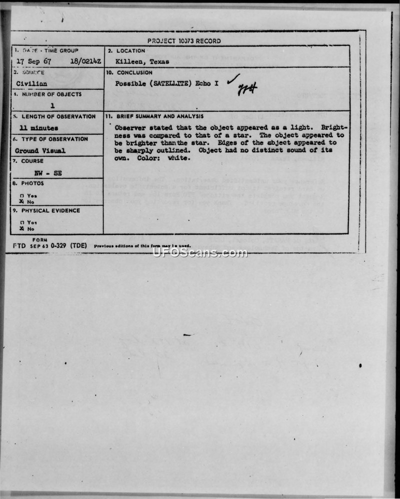 This document contains a Project 10073 record regarding a UFO sighting reported by a 13-year-old civilian in Killeen, Texas, on September 17, 1967. The witness observed a single, white, circular object that appeared 2.5 times brighter than the brightest star. The object was seen moving slowly across the sky from the southeast before stopping in mid-air and dropping 25 degrees to the right. The witness noted that a smaller white object appeared to circle the main object clockwise before it faded out. The observation lasted approximately 11 minutes. The Air Force's Foreign Technology Division initially deemed the information insufficient for scientific evaluation and requested the witness complete a formal FTD Form 164. Following the submission of the report, the official conclusion recorded on the project file was that the object was possibly the Echo I satellite.
