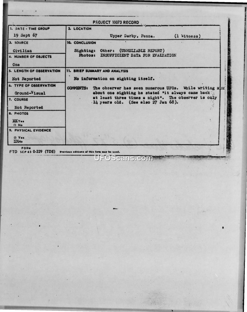 Project 10073 Record — Upper Darby, Pennsylvania, 19 September 1967
