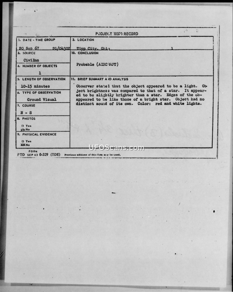 Project 10073 Record: Sighting of 20 September 1967, Tipp City, Ohio