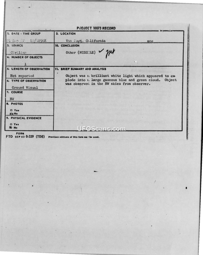 A civilian report of a brilliant light in the sky over Van Nuys, California, on September 21, 1967, was investigated by the Air Force. The event was officially attributed to a Minuteman I missile launch from Vandenberg Air Force Base, with the visual effects caused by light interacting with the missile's vapor trail.