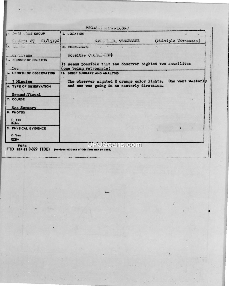 A 14-year-old witness in Nashville reported two orange, glowing objects moving in opposite directions on September 21, 1967. Project Blue Book investigated the incident and concluded the objects were likely satellites.