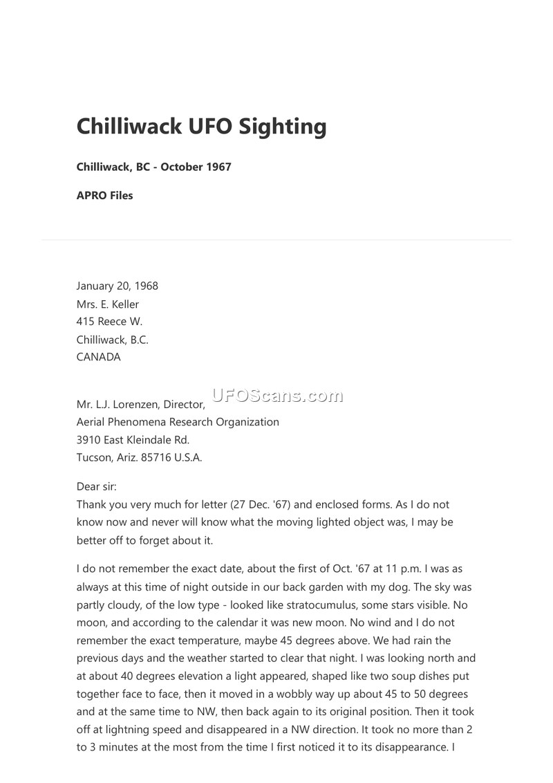 On January 20, 1968, Elizabeth Keller wrote to L.J. Lorenzen, the Director of the Aerial Phenomena Research Organization (APRO), to report a sighting she experienced in Chilliwack, British Columbia, around the first of October 1967. Keller, who was in her back garden with her dog at approximately 11:00 p.m., observed an object in the northern sky at an elevation of about 40 degrees. She described the object as being shaped like two soup dishes placed face-to-face, appearing as an oval-shaped light approximately 28 inches in size at arm's length. The object was partially obscured by thin stratocumulus clouds, and she noted there was no sound. During the observation, which lasted between two and three minutes, the object moved in a wobbly fashion, ascending 45 to 50 degrees toward the northwest before returning to its original position. It then departed at what she described as 'lightning speed' in a northwest direction. Keller, who possesses a background in photography and experience with 'kinotheodolite' equipment used by the Luftwaffe during World War II, as well as work for the Canadian Department of National Defence, expressed skepticism regarding UFOs, stating she is not a religious person or a fanatic. She noted that she initially felt annoyed by the possibility that she had seen a UFO, as she did not believe they existed. She requested that her name not be associated with the report due to the social stigma surrounding the topic in her community. The letter also includes a postscript explaining the technical function of a kinotheodolite.