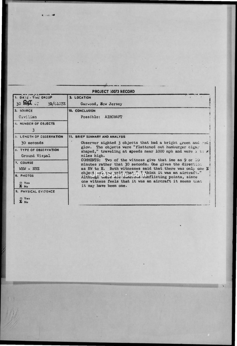 A student in Garwood, New Jersey, reported seeing three cigar-shaped, glowing objects on October 30, 1967. The Air Force investigation concluded the sighting was likely an aircraft due to conflicting witness reports.