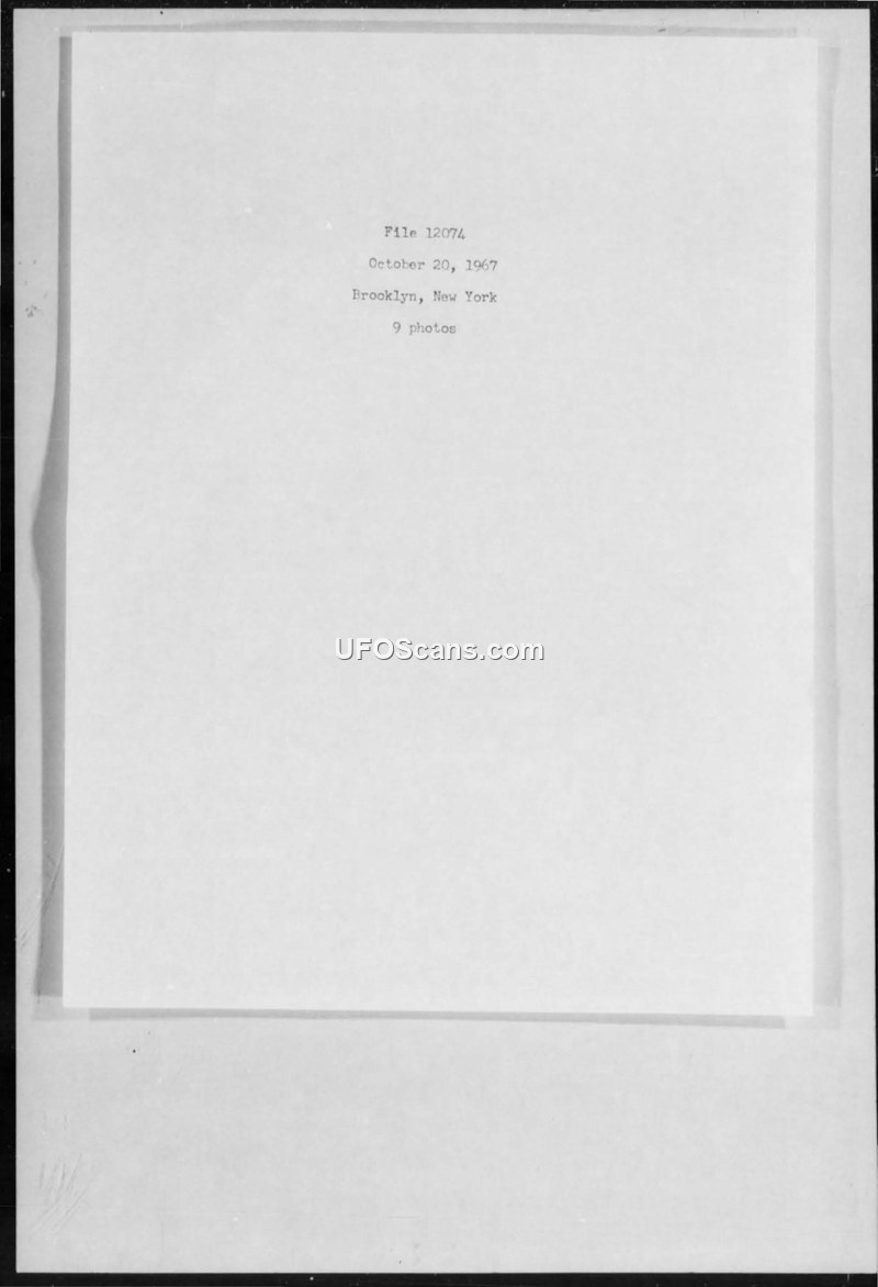This document, identified as File 12074, consists of a cover sheet and nine photographic images. The cover sheet indicates that the file pertains to an event or site in Brooklyn, New York, dated October 20, 1967. The document is marked as 'OFFICIAL USE ONLY' and is attributed to the Foreign Technology Division of the Air Force Systems Command (AFSC). The photographs themselves depict a residential or suburban-style building and a separate scene showing an individual on a ladder near trees, possibly performing maintenance or landscaping work. No narrative text, incident description, or analysis is provided within the document to explain the context of these photographs or their relationship to any specific investigation.
