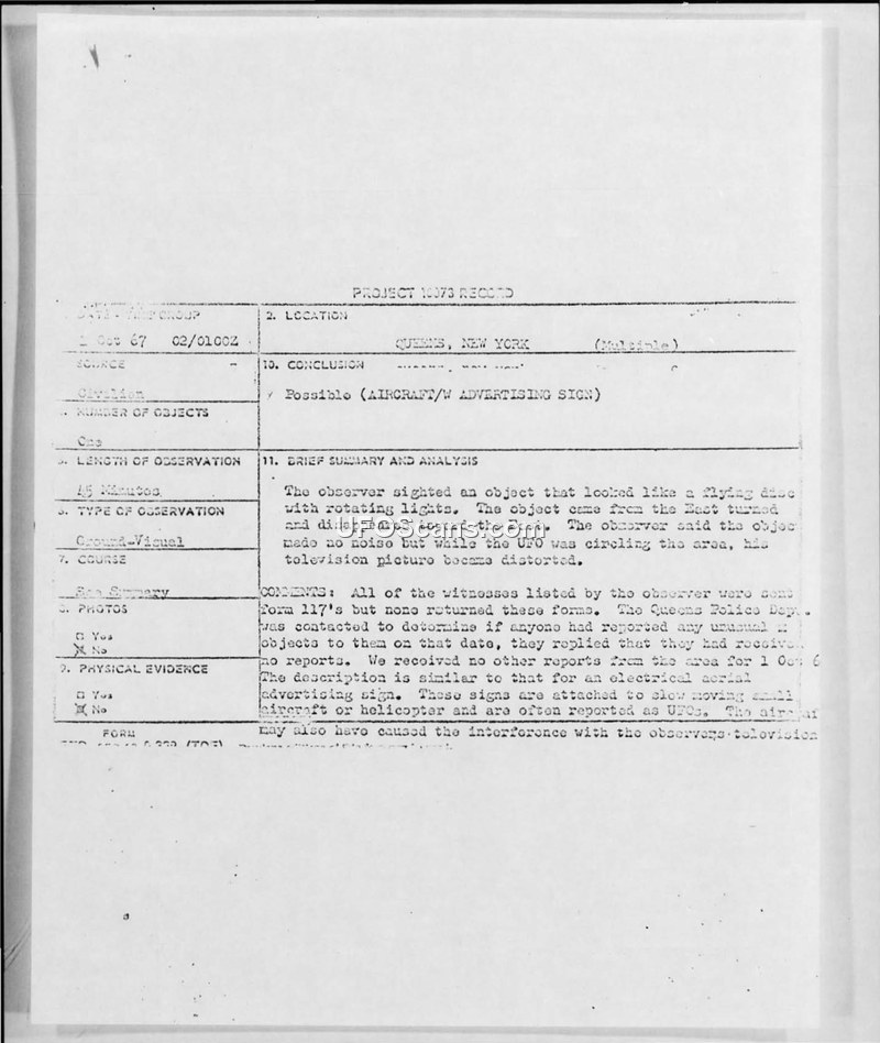 A resident of Bayside, Queens, reported a 45-minute sighting of a flying disc on October 1, 1967. The Air Force investigated and concluded the object was likely an aerial advertising sign.