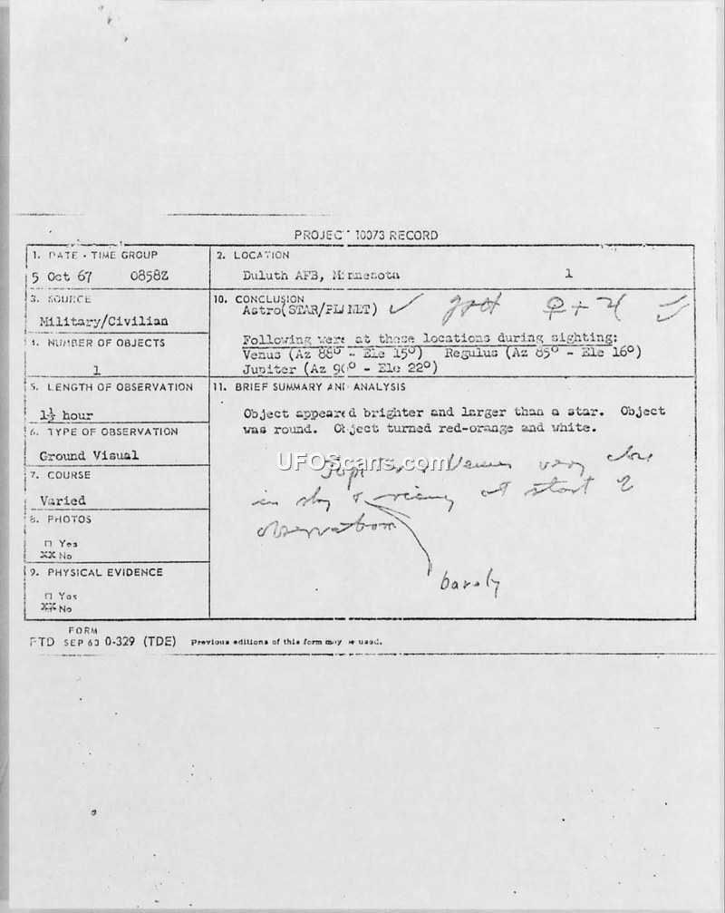 On 5 October 1967, at 0858Z, a sighting of an unidentified aerial object was reported at Duluth AFB, Minnesota. The observation lasted for approximately one and a half hours. Witnesses, including 2/LT Eric Olson and SSGT Kickerbocker of the 74th Air Defense Missile Squadron, described the object as round, appearing brighter and larger than a star, and changing color from red-orange to white. The object was observed to move slowly up and down. The sighting occurred concurrently with a Strategic Air Command (SAC) flare drop. Weather conditions were reported as clear with a six-degree centigrade inversion at 1200 feet. The official conclusion reached by the Air Force was that the object was an astronomical phenomenon, specifically a star or planet. The reporting officer noted that while witnesses initially compared the size of the object to a baseball at arm's length, they later adjusted their estimate to one-eighth the size of the full moon, which was considered a more accurate gauge. The report was forwarded to the University of Colorado for the attention of Dr. Condon.