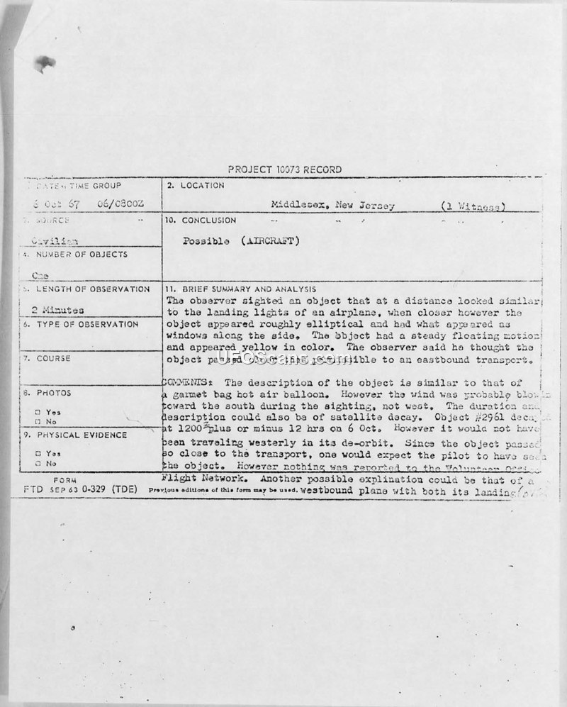A 1967 UFO sighting in New Jersey was investigated by the Air Force under Project 10073. The official conclusion was that the object was likely an aircraft, despite the witness's detailed description of a non-saucer, windowed, yellow, floating object.