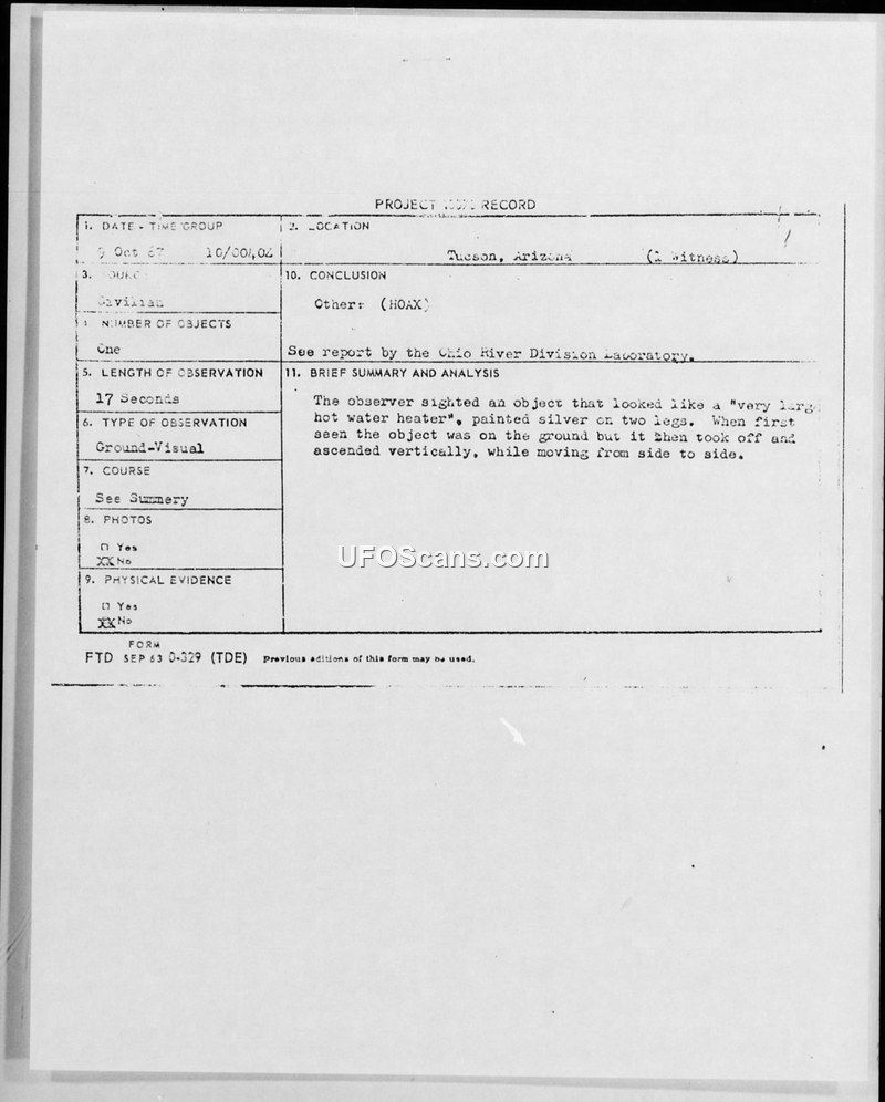 An investigation into a 1967 UFO sighting in Tucson, Arizona, concluded that the reported landing and physical impressions were a hoax. The Air Force determined the impressions were man-made and attributed the report to the witness's imagination.