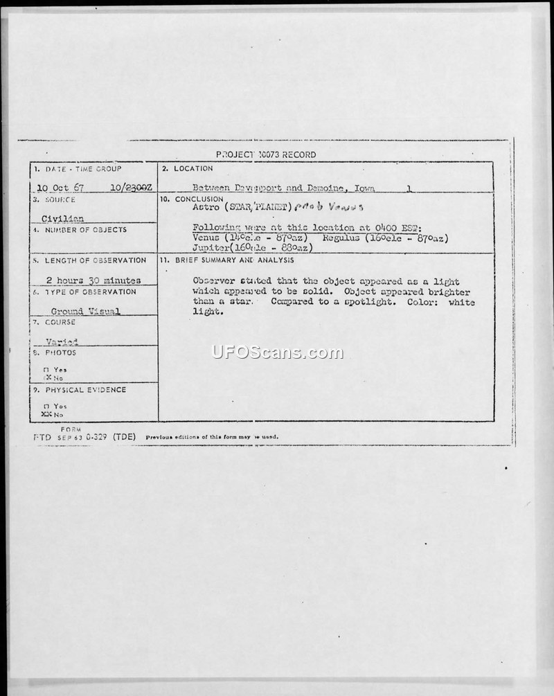 A civilian reported a 2.5-hour sighting of a metallic, football-shaped object in Iowa on October 10, 1967. The Air Force officially concluded the sighting was an astronomical event involving Venus, Jupiter, or Regulus.