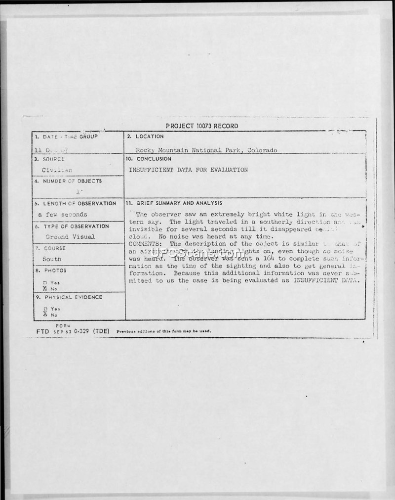 Project 10073 Record — Sighting in Rocky Mountain National Park, Colorado, October 11, 1967