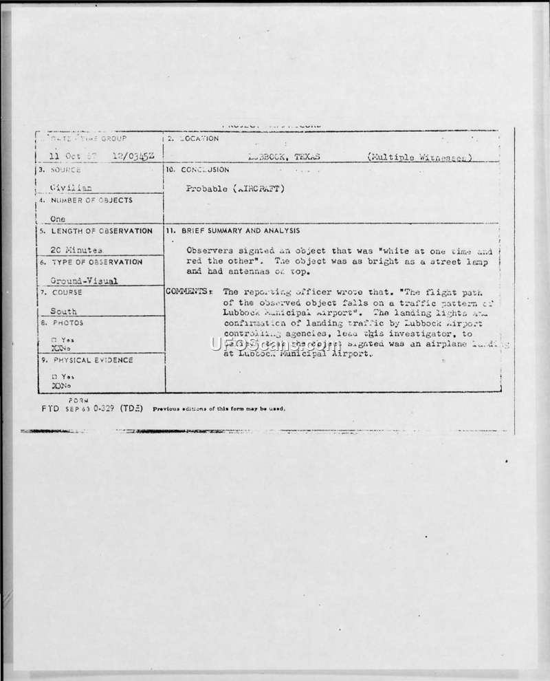 A 1967 UFO sighting in Lubbock, Texas, was investigated by the Air Force and officially attributed to an aircraft landing at the local municipal airport. The witness reported a round, glowing object, but investigators determined the flight path matched local airport traffic patterns.