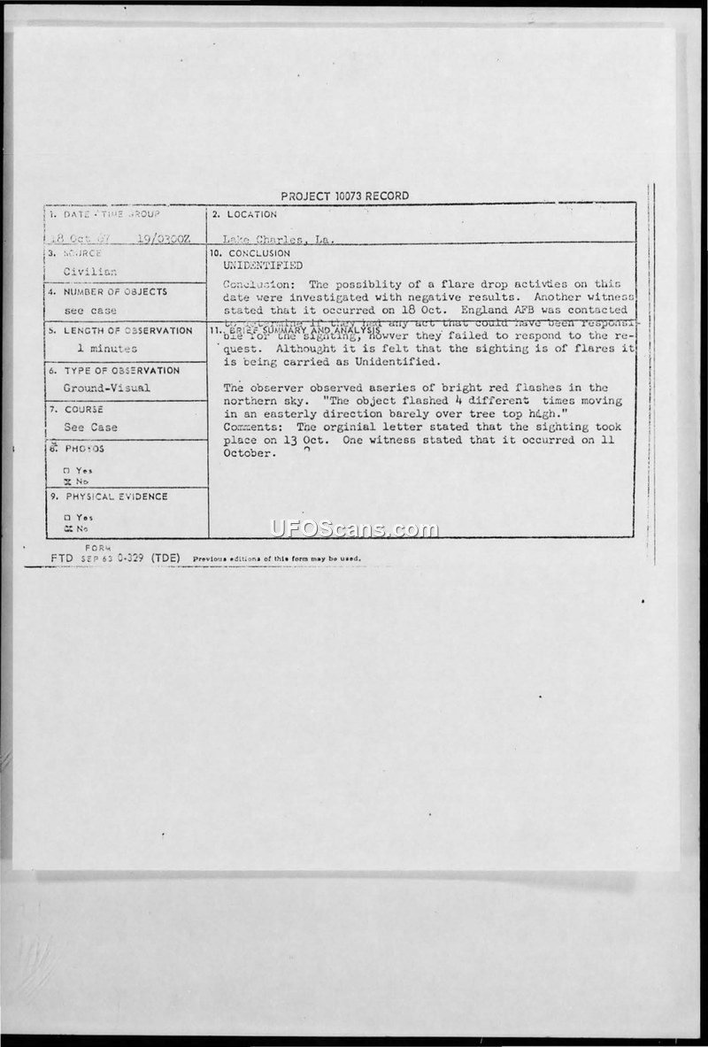 Project 10073 Record: UFO Observation, Lake Charles, Louisiana, October 1967