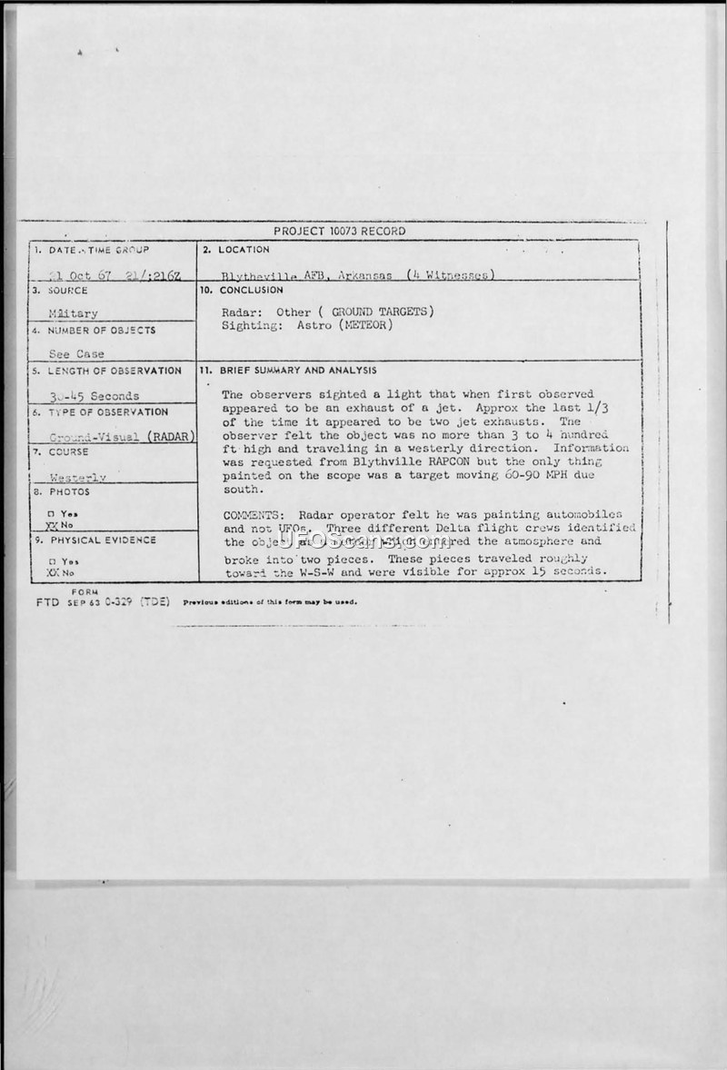Project 10073 Record — Blytheville AFB, Arkansas, 21 October 1967