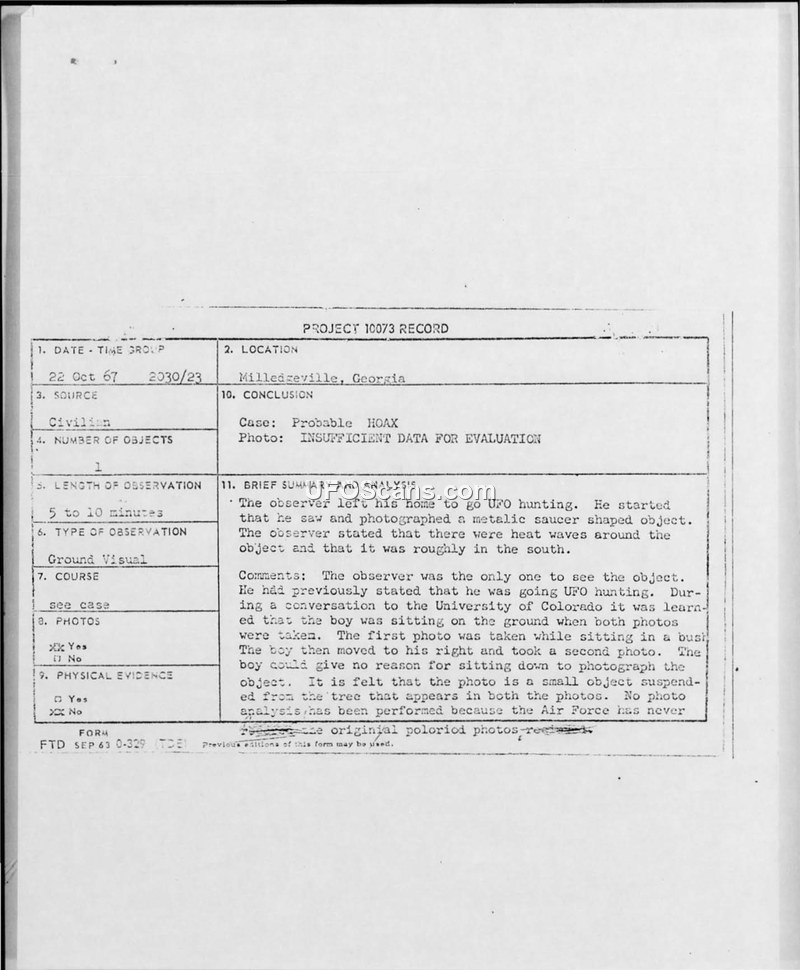 A 13-year-old boy in Milledgeville, Georgia, reported photographing a saucer-shaped object on 22 October 1967. The Air Force investigation concluded the incident was a probable hoax, suggesting the photos depicted a small object suspended from a tree.