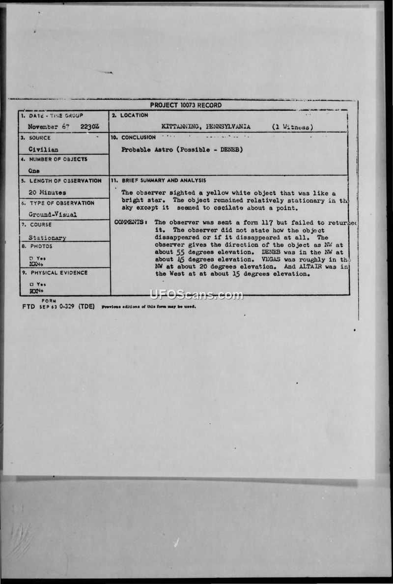 A civilian reported a stationary, star-like object in Kittanning, Pennsylvania, in November 1967. The Air Force investigation concluded the object was likely the star Deneb.