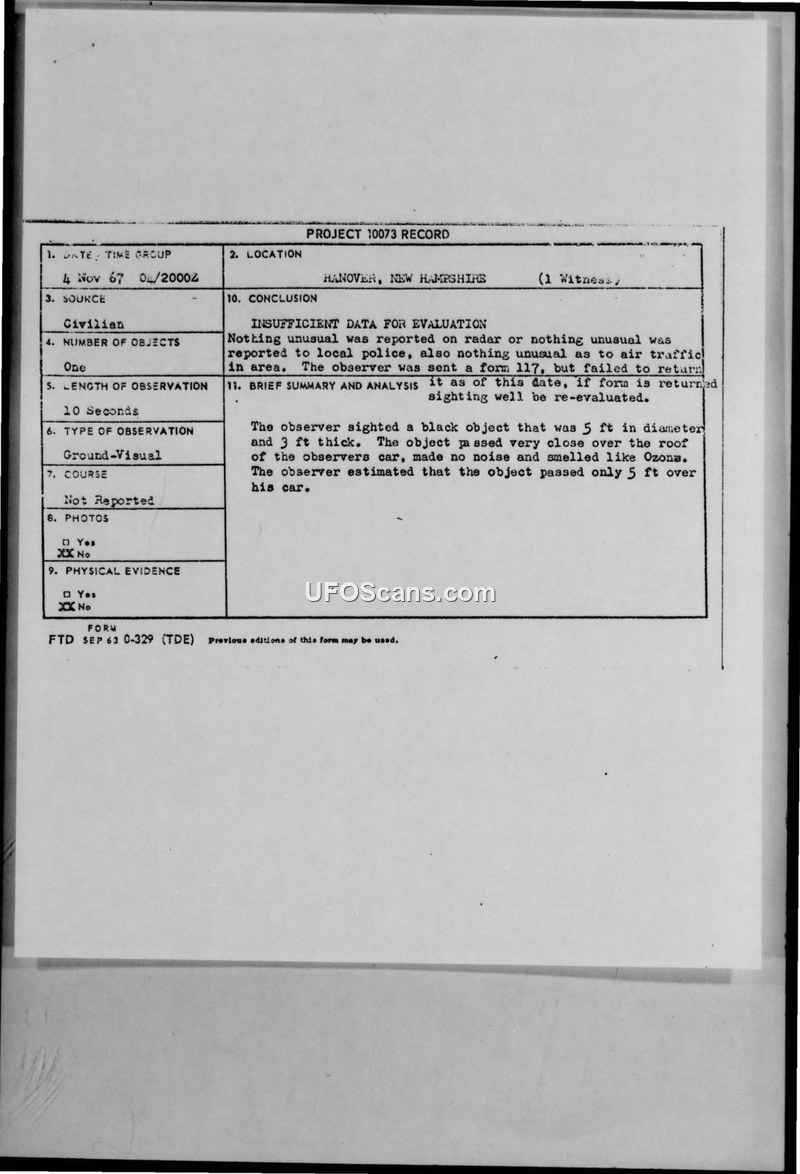 A 19-year-old witness reported a low-flying, black, circular object in Hanover, New Hampshire, on November 4, 1967. The Air Force investigation concluded there was insufficient data to evaluate the sighting, as no corroborating radar or police reports were found and the witness did not provide follow-up documentation.