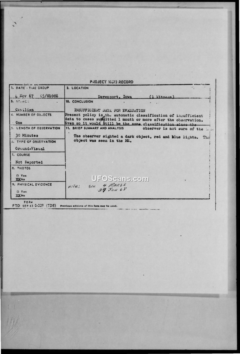 A civilian in Davenport, Iowa, reported a 30-minute sighting of a dark object with red and blue lights on November 4, 1967. The U.S. Air Force classified the report as 'insufficient data' due to the delay in submission.