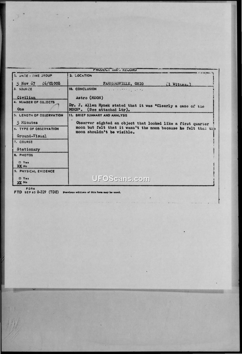 A civilian report of a UFO in Farmersville, Ohio, on 5 November 1967 was investigated by the Air Force and Dr. J. Allen Hynek. The object was officially identified as the moon, despite the witness's initial skepticism.