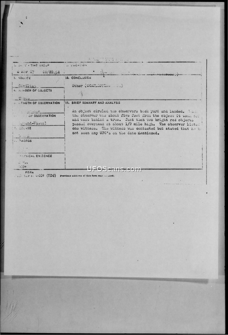 The observer reported an object landing in their backyard, but subsequent contact with the witness resulted in a statement that they had not seen any UFOs on the date mentioned.