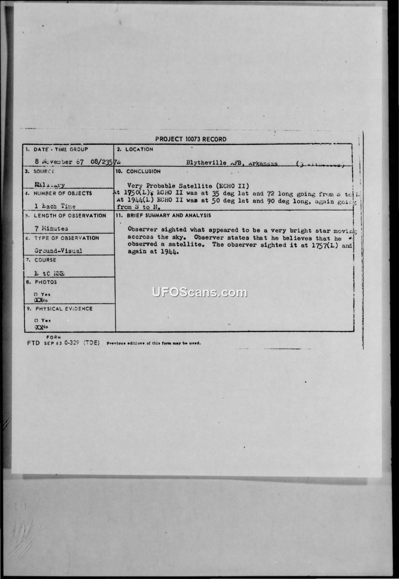 On November 8, 1967, TSgt Charles F. Brite, a control tower operator at Blytheville Air Force Base, Arkansas, reported observing an unidentified aerial phenomenon. The object was described as a very bright, white, star-like light that moved rapidly from south to north. TSgt Brite, along with A1C William L. Franklin, observed the object on two separate occasions that evening. The witnesses noted that the object appeared to be solid but fuzzy, and they believed it was reflecting light. The sighting lasted approximately seven minutes. The observers reported that the object would reappear in a westerly direction every 90 to 110 minutes. Following the report, the Air Force's Foreign Technology Division (FTD) initiated an investigation under Project 10073. The FTD concluded that the object was a 'Very Probable Satellite (ECHO II).' This conclusion was based on the object's trajectory, which matched the known path of the ECHO II satellite at the time of the sightings. The report includes detailed questionnaires completed by the witnesses, as well as official correspondence from the FTD requesting further information to ensure a scientific investigation. The witnesses were deemed reliable, and the consensus among the reporting officials was that the phenomenon was a passing satellite.