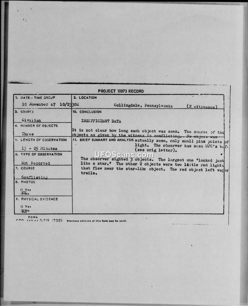 A 13-year-old witness reported a 15-25 minute sighting of three objects in Collingdale, PA, on 10 November 1967. The Air Force classified the case as 'INSUFFICIENT DATA' due to conflicting witness accounts.