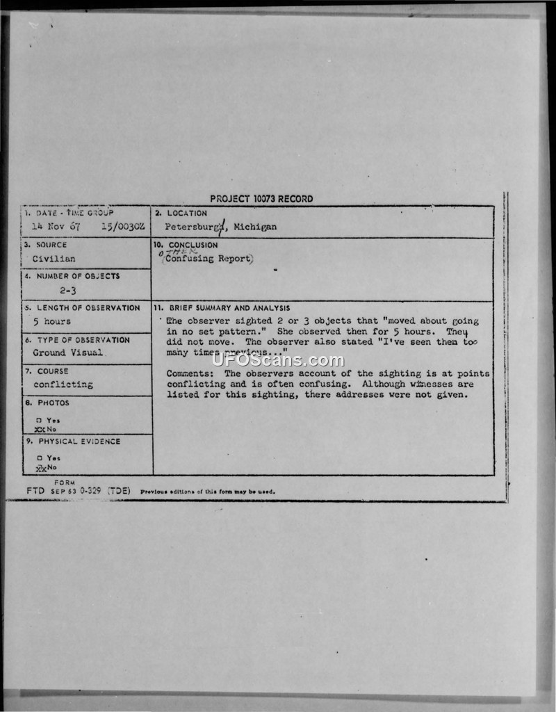 A civilian in Petersburg, Michigan, reported observing multiple unidentified objects over a five-hour period on November 14, 1967. The Air Force classified the report as 'confusing' and 'conflicting' due to the observer's inconsistent account and lack of verifiable witness information.