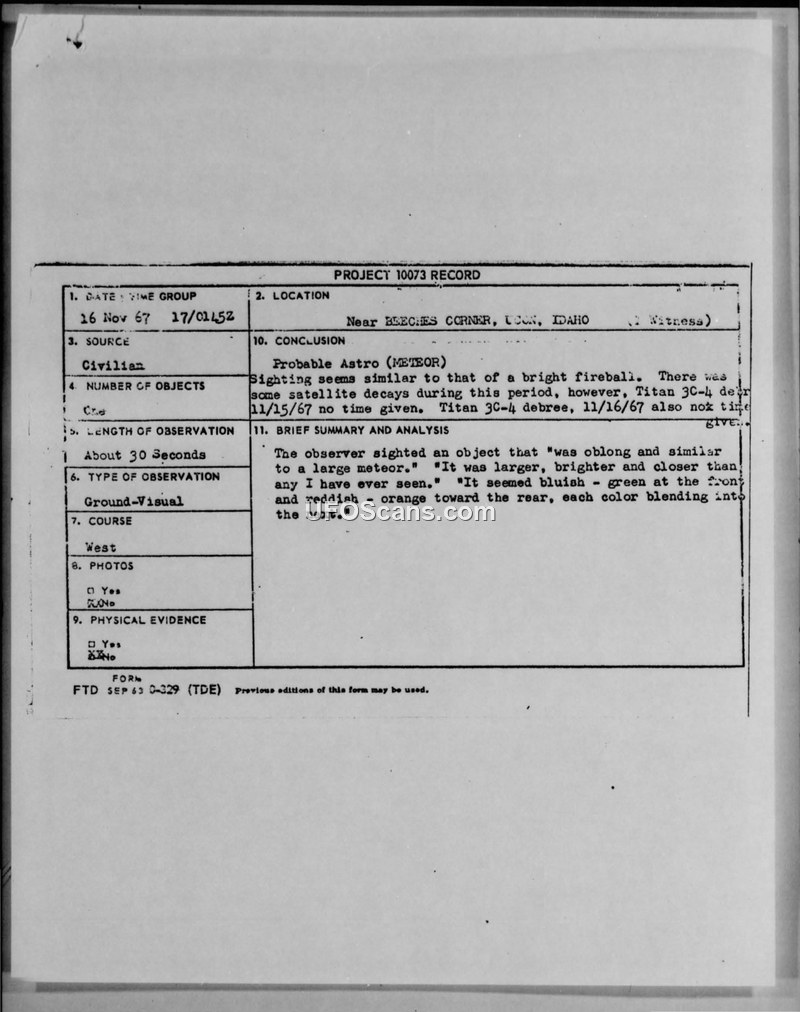 A civilian reported an oblong, glowing object in Ucon, Idaho, on November 16, 1967. The Air Force categorized the event as a probable meteor, citing potential satellite debris.