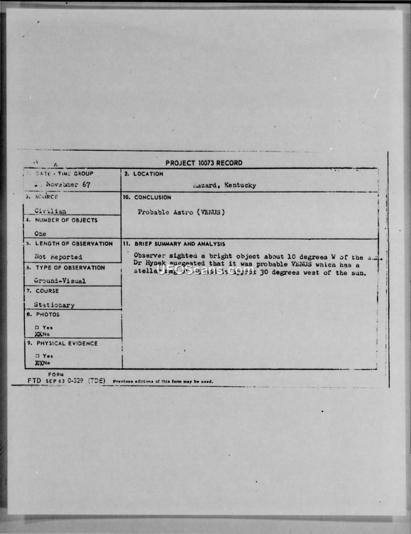 A sighting of a metallic object in Hazard, Kentucky, in November 1967 was investigated by the UFO office. The object was officially identified as the planet Venus by Dr. Hynek and Major Quintanilla.