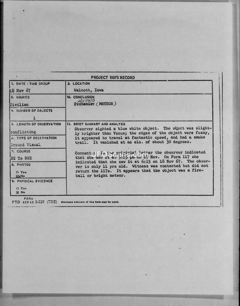Project 10073 Record — Sighting in Walcott, Iowa, November 1967