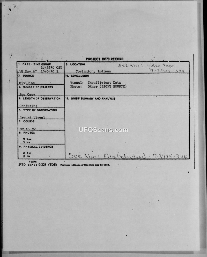 Project 10073 Record: UFO Sighting, 18 November 1967, Covington, Indiana