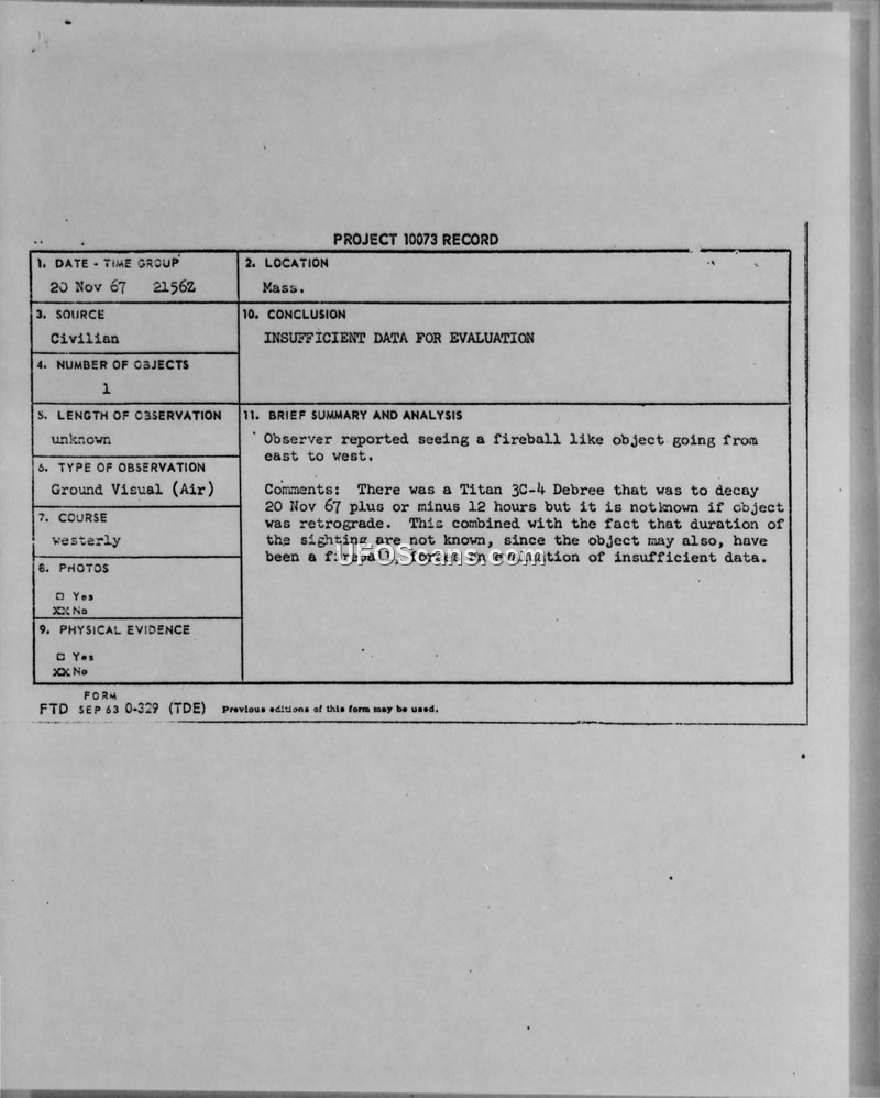 A 1967 sighting of a fireball-like object in Massachusetts was investigated under Project 10073. The official conclusion was insufficient data, noting the potential for Titan 3C-4 rocket debris as a cause.