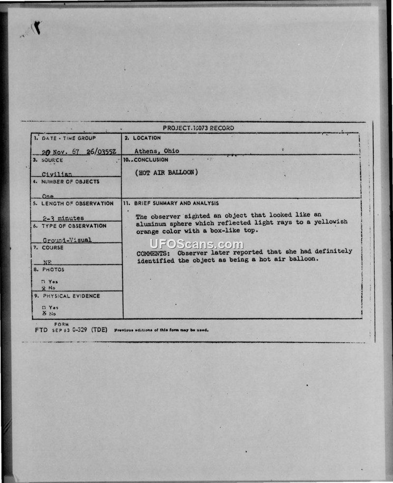 A student in Athens, Ohio, reported a disc-shaped UFO on 20 November 1967. The Air Force investigated the sighting and concluded it was a homemade apparatus constructed from candles and plastic sheets.