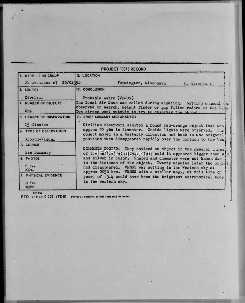 This document contains a collection of records, including a Project 10073 report, a military teletype, and correspondence regarding a UFO sighting near Farmington, Wisconsin, on March 21, 1967. Civilian observers, including a local farmer, reported seeing a round, red-orange object, approximately 20 yards in diameter, hovering 300 feet above a barn. The witnesses described the object as having inside lights and a glowing orange dome. During the 15-minute observation, the object moved in an easterly direction before returning to its original position and disappearing rapidly over the western horizon. The witnesses also reported that their radio stopped functioning and their dog fled into the barn. Upon contacting the nearby Osceola Air Force Station, the witnesses were told by personnel that they could see an orange light over the farm. Military personnel from the 674th Radar Squadron investigated the incident, confirming that no unusual activity was detected on search, height finder, or gap filler radars. The official Air Force conclusion was that the sighting was likely the planet Venus, which was setting in the western sky at the time and would have been the brightest object visible. The report notes that Venus has been responsible for numerous alleged UFO observations during this time of year.