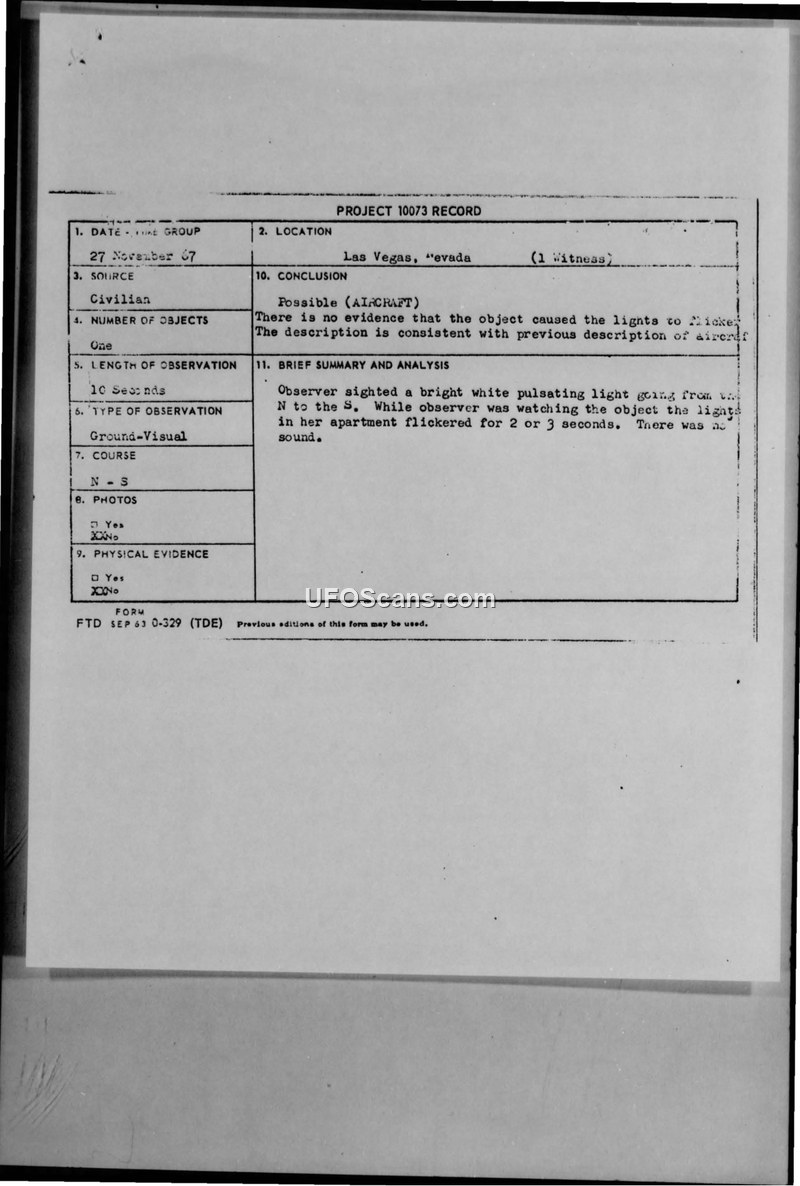 On November 27, 1967, at approximately 1900 hours, a civilian witness in Las Vegas, Nevada, observed a bright white, pulsating light moving from the north to the south. The observation lasted for 10 seconds. The witness, described as a high school graduate and deemed reliable, reported that while watching the object, the lights in her apartment flickered for two or three seconds. She noted that there was no sound associated with the object. The incident was reported to the Air Force and processed under Project 10073. The official conclusion reached by the Foreign Technology Division was that the sighting was a 'Possible (AIRCRAFT),' noting that there was no evidence the object caused the electrical flickering and that the description was consistent with previous aircraft reports. Despite this, the investigating officer, 2LT Peter B. Thatcher, expressed personal doubt, stating, 'Since there was no sound at all, I doubt if this could have been an airplane.' The Air Force subsequently informed the witness that the initial information provided was insufficient for a scientific investigation and requested that she complete an AF Form 117 for further analysis.
