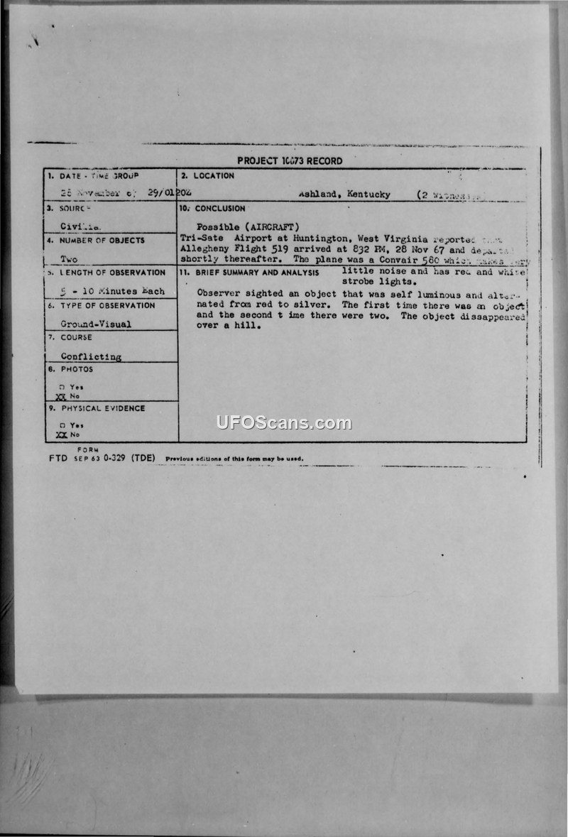 Multiple witnesses in Ashland, Kentucky, reported seeing unidentified luminous objects on November 28, 1967. The Air Force investigation concluded the sightings were likely caused by an Allegheny Airlines Convair 580 flight arriving at a nearby airport.