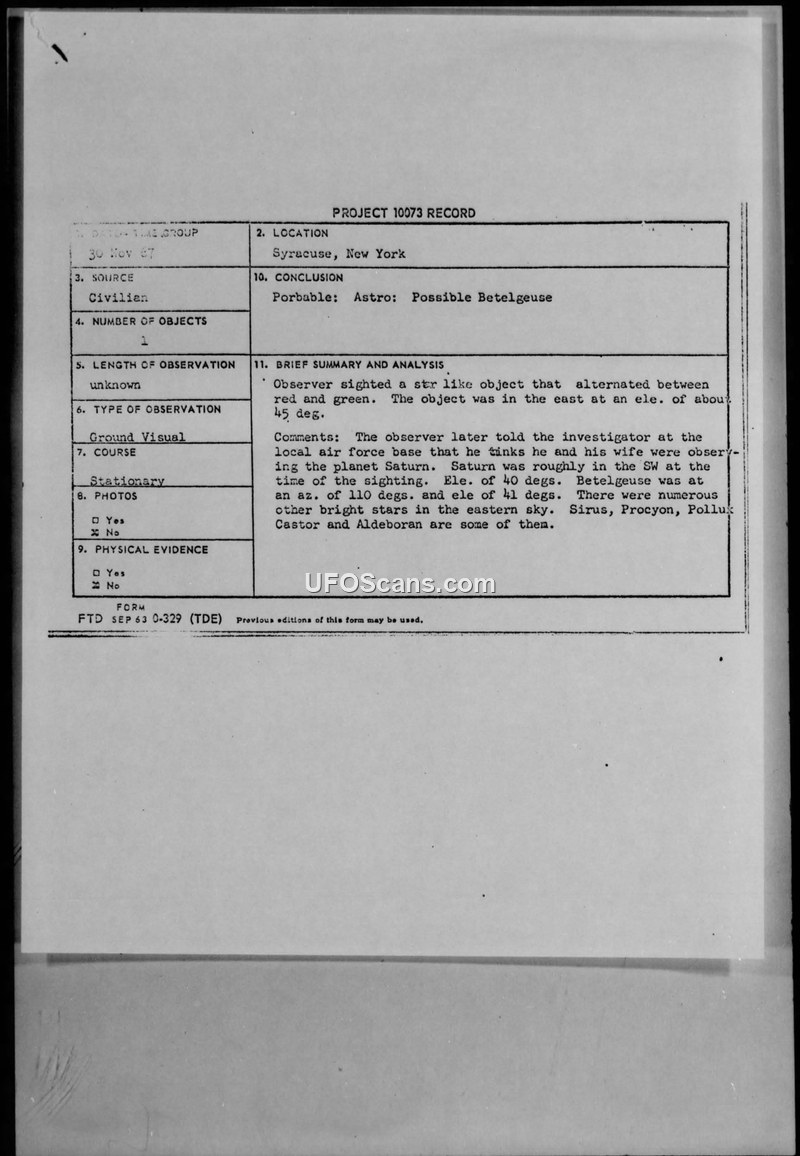 A civilian in Syracuse, New York, reported a stationary, color-changing object in the sky on 30 November 1967. Air Force investigators concluded the sighting was likely an astronomical event involving bright stars or planets.