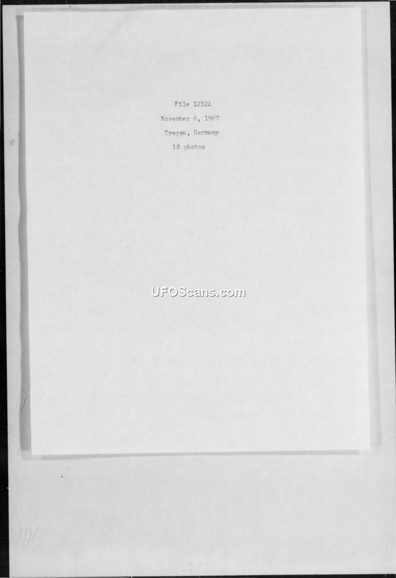 This document consists of a cover sheet and eighteen photographic images related to File 12124, dated November 6, 1967, in Treysa, Germany. The cover sheet explicitly identifies the location as Treysa, Germany, and notes the inclusion of 18 photos. The subsequent pages contain photographic negatives or prints showing various light patterns, including circular or orb-like shapes and linear arrangements of light points against a dark background. No descriptive text, witness statements, or official analysis are provided within the document to explain the nature of the lights or the circumstances of the sighting.