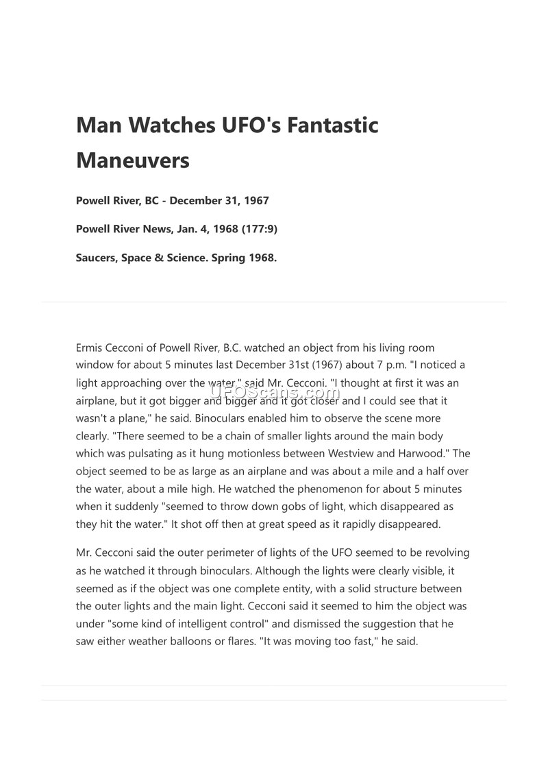 This document is a press report from the Powell River News detailing a UFO sighting by Ermis Cecconi on December 31, 1967. It describes the witness's observation of a structured, light-emitting object hovering over the water before departing at high speed.