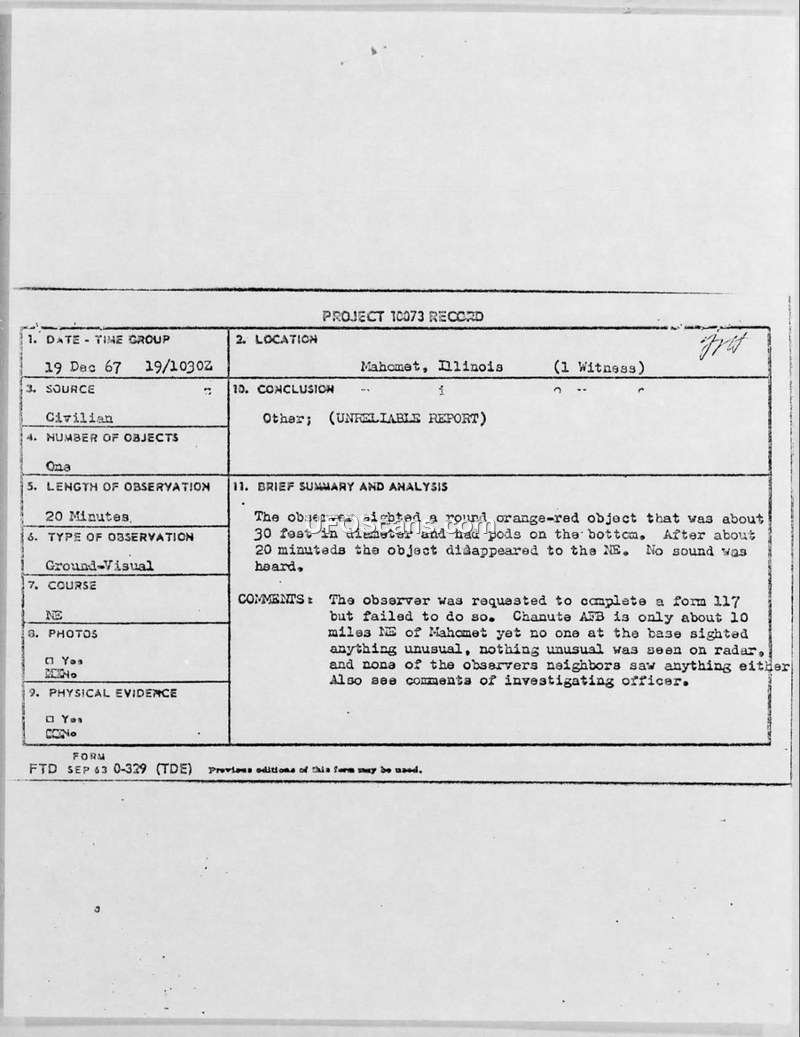 A civilian reported a UFO sighting in Mahomet, Illinois, in December 1967. The Air Force investigation concluded the report was unreliable due to a lack of corroborating evidence and the witness's failure to provide formal documentation.