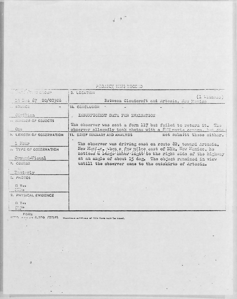 Project 10073 Record — Sighting between Cloudcroft and Artesia, New Mexico, December 19, 1967