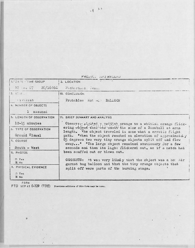 A 1967 sighting of a pulsating orange object in Richardson, Texas, was investigated by the Air Force. The official conclusion identified the object as a hot air balloon.