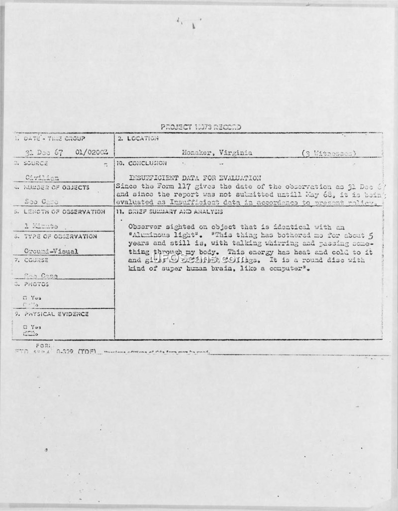 This document collection contains various records, correspondence, and sighting reports associated with Project Blue Book from December 1967. A primary case involves a civilian report from Honaker, Virginia, dated December 31, 1967. The observer described a round, disc-like object that emitted an 'aluminous light' and produced a 'talking whirring' sound. The witness claimed the object emitted an energy that caused physical sensations of heat and cold, and described the object as having a 'super human brain, like a computer.' Due to the significant delay in reporting—the form was not submitted until May 1968—the official Air Force conclusion was 'INSUFFICIENT DATA FOR EVALUATION.' The collection also includes a military message from the USCGC SPENCER regarding a visual sighting of an object that appeared to be disintegrating like a flare, and correspondence between Major Héctor Quintanilla, Jr., and a civilian who admitted to faking a UFO photograph using black paper and thread. The file further contains various blank and partially completed 'Sighting of Unidentified Phenomena' questionnaires, indicating the administrative process used by the Air Force to collect and evaluate public reports during this period.