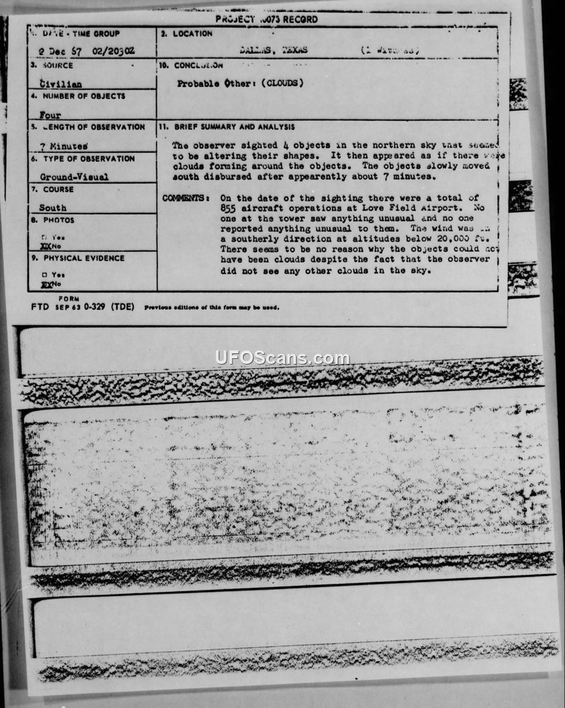 A physician in Dallas reported four objects that appeared to form clouds around them on December 2, 1967. The Air Force investigated the report and concluded the objects were likely clouds, supported by a lack of corroborating reports from the local airport tower.